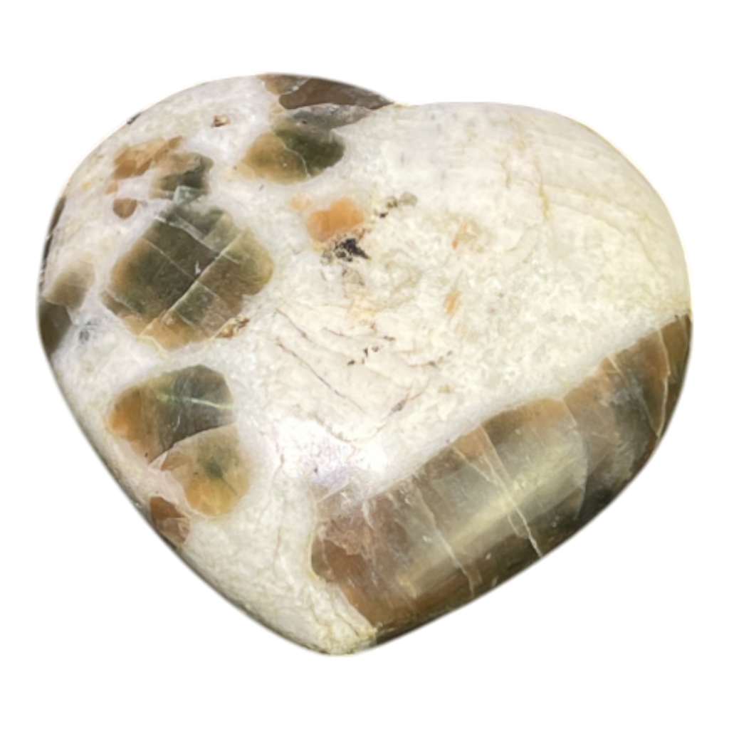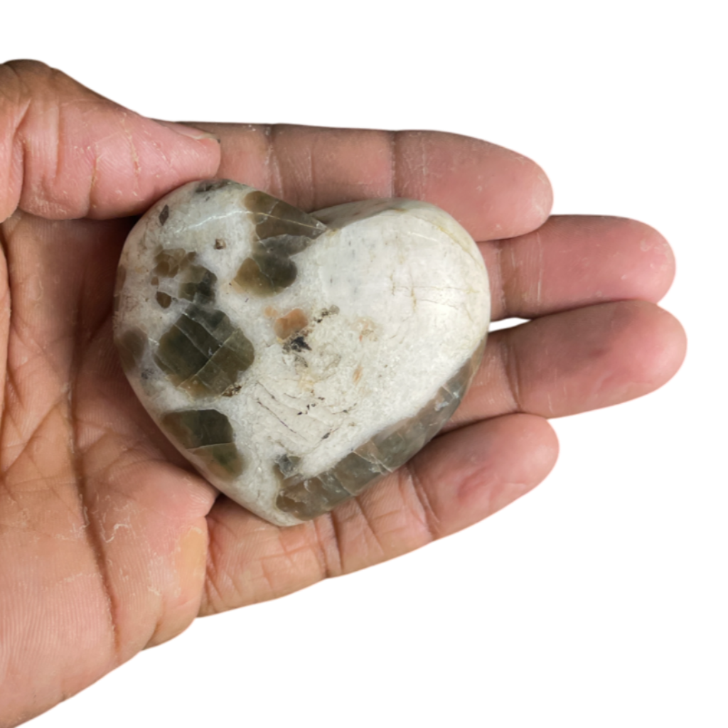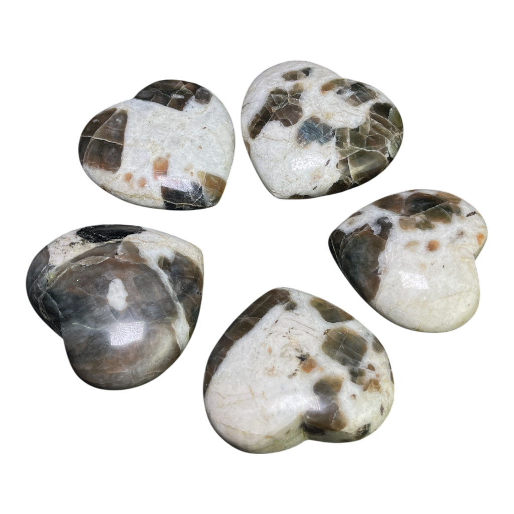 This brown moonstone heart radiates a soft, grounding energy with its warm, chocolate-to-caramel hues. The surface of the stone often reveals a gentle shimmer or adularescence—a subtle glow that seems to move across the surface as light shifts, characteristic of moonstone. Smooth and polished, it fits comfortably in the palm of the hand, perfect for meditation, crystal grids, or display.