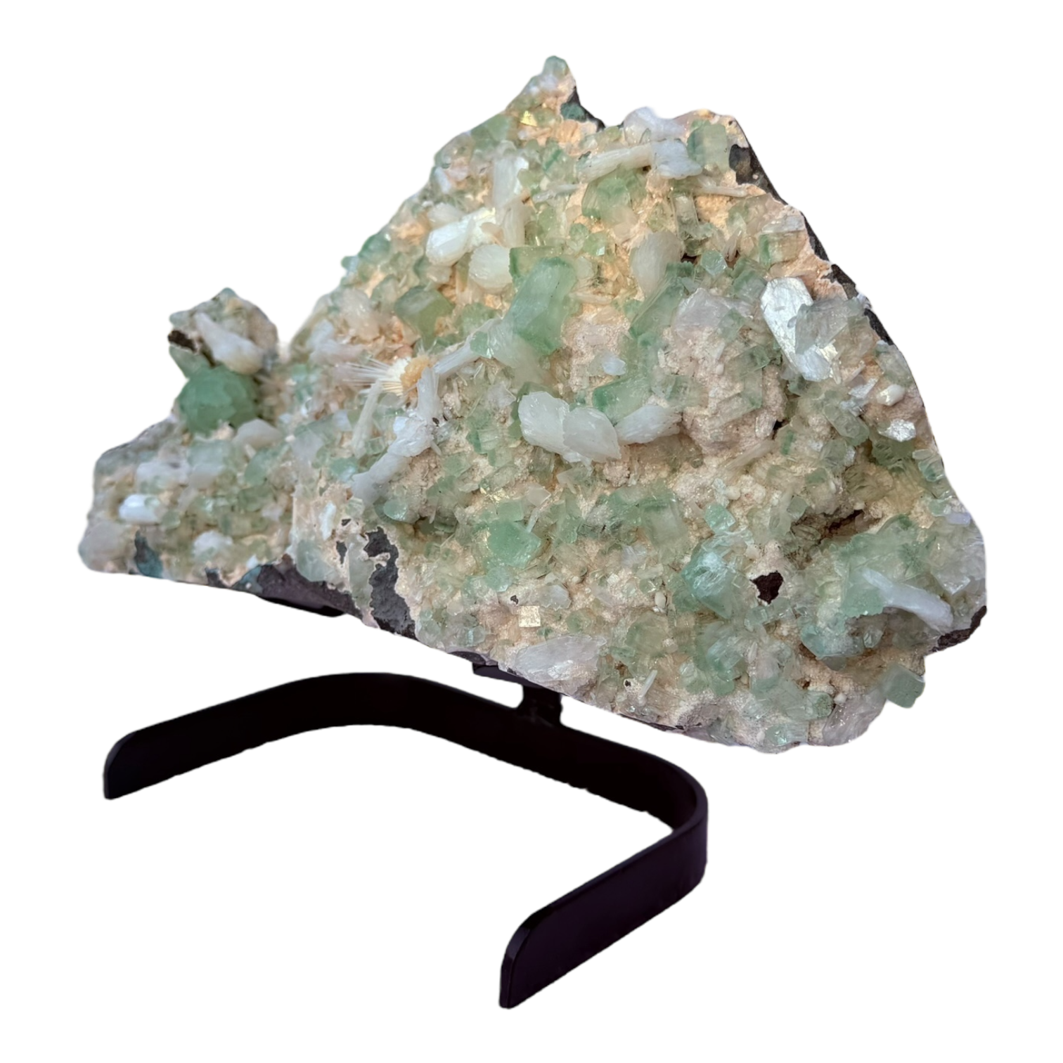 Beautiful large horizontally placed and position specimen of vivid green Apophyllite with stilbite on Brown Micro Heulandite Matrix from Pune Maharashtra India.