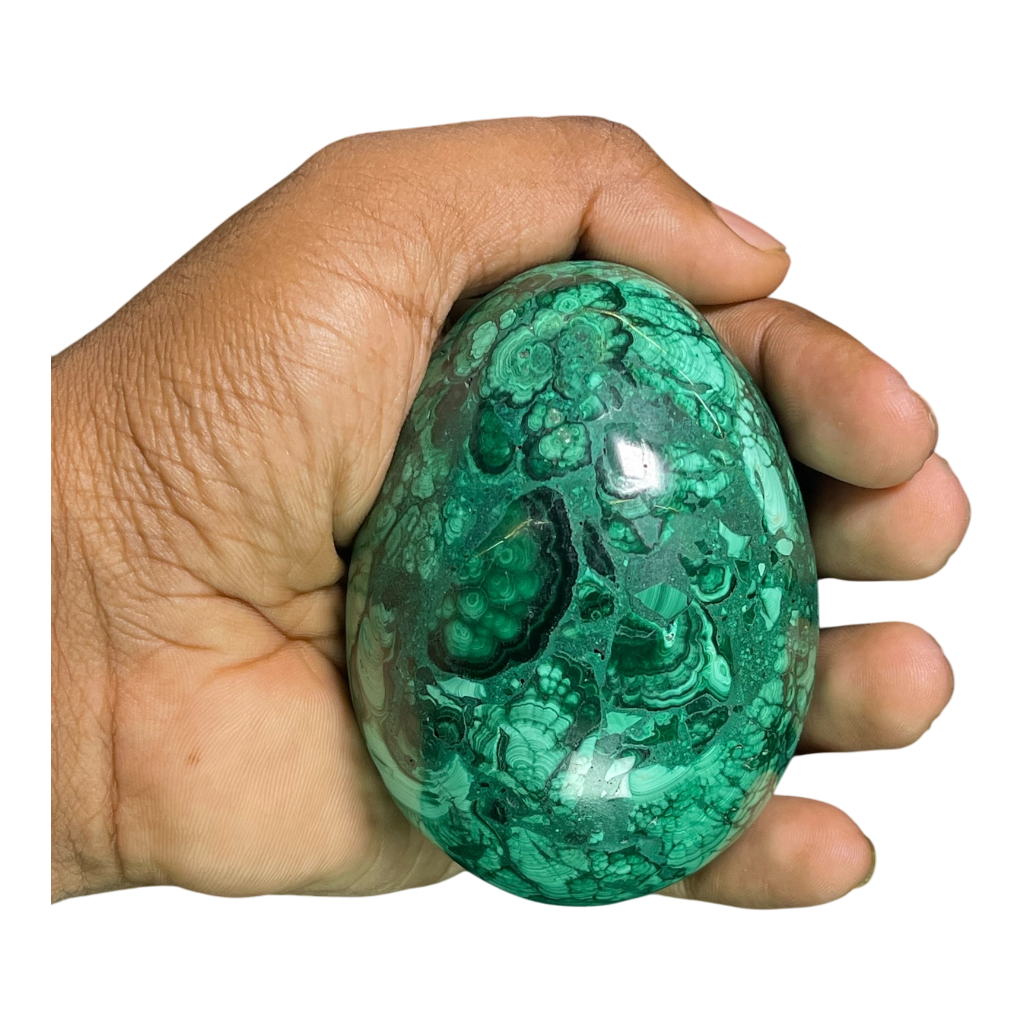 Polished Malachite Egg from Madagascar showcases stunning, banded patterns in shades of green, from light mint to deep emerald, expertly polished to highlight malachite's natural beauty.